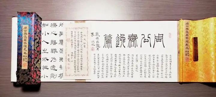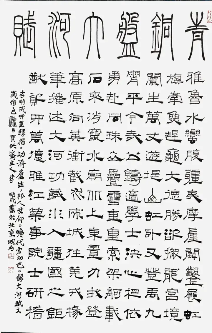 尤为称道者,当属李明成之小隶书。观其作,结体稳健,笔力沉厚,可知其深谙艺术传承之道。李明成以汉隶为根基,深耕《熹平石经》《受禅表》等西汉经典,得古碑雄浑气象;又取元之吴睿、萧维斗凝练笔意,纳明之文征明、陆世仁典雅结体,博采众长而熔铸一炉,终成独树一帜之风格。此等师古而不泥古、创新而不失本的智慧,正是艺术传承之真谛。