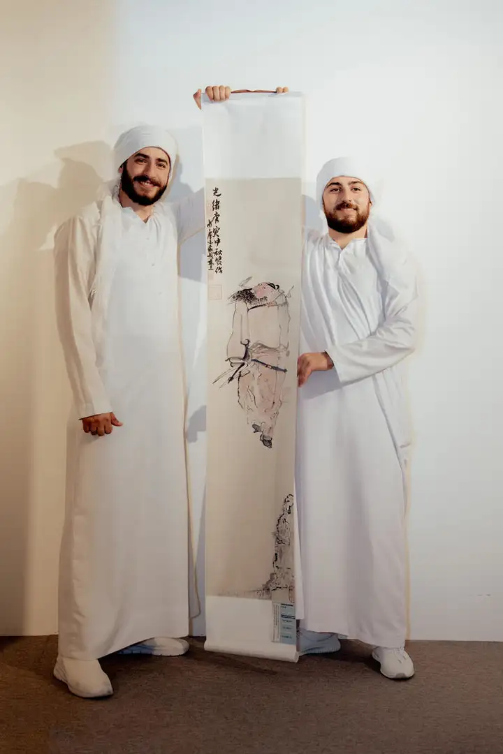画作以淡墨写意塑人物形神,线条简练却精准捕捉人物气韵,留白的章法尽显中式美学的含蓄之妙。汉字题款与人物造像相映成趣,突破语言与地域的界限,让阿拉伯观众读懂中国人物画“以形写神”的精髓。这不仅是艺术的展示,更是文化的桥梁——一笔水墨跨越波斯湾,让中国传统绘画的魅力在中东绽放,成为丝路文化互鉴的鲜活注脚。