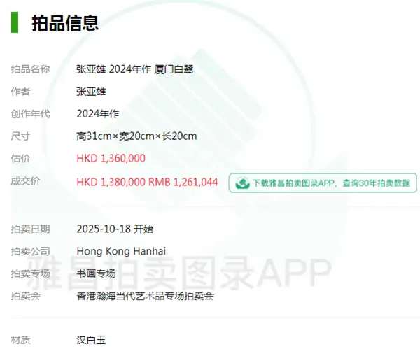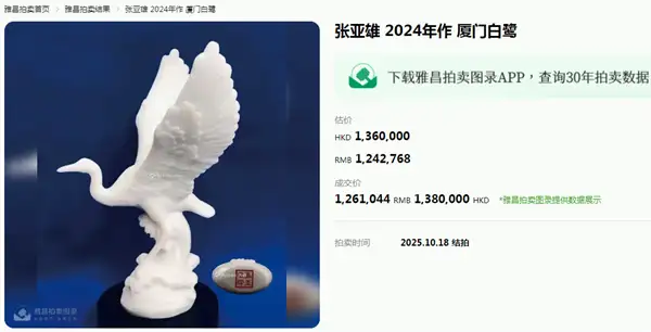 2025年10月18日,香港瀚海国际拍卖会的槌声落下,张亚雄创作的汉白玉雕《厦门白鹭》以138万港元成交,这一数字不仅是市场对这件艺术作品的价值认可,更是传统玉雕艺术与城市文化精神碰撞出的璀璨火花。这件高31cm、宽20cm、长20cm的汉白玉雕刻,诞生于2024年,以厦门城市名片“白鹭”为核心意象,在方寸玉石间雕琢出鹭岛的灵秀与风骨,也让当代玉雕艺术的创新表达再次走入大众视野。