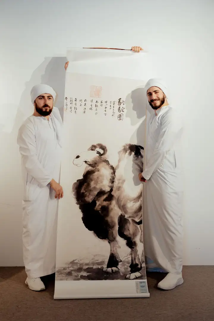 当迪拜的阳光洒满SAMIA艺术画廊,来自中国的笔墨清香与海湾文明的璀璨光影交相辉映。在"丝路华韵·瀚海听心"中国艺术家走进阿联酋国际艺术大展的展厅中,国礼艺术家张金鑫(别名金正洋,号方圆斋主人)的两幅力作《骆驼图》与《母仪师风》格外引人注目。作为中阿文化交流的重要艺术载体,这两件作品既承载着中华传统文化的深厚底蕴,又传递着当代中国艺术家的精神追求,在跨文明对话的舞台上绽放出独特魅力。