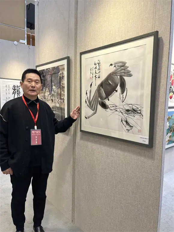 山水画,融北派之雄浑与南派之灵秀,构图疏密有致,笔墨苍润相济。花鸟虾蟹画,承齐白石“红花墨叶”技法,写意形神兼备,赋色明快鲜活。