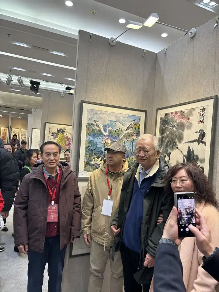 众多参观者在朱建红老师作品《祥和一塘》前合影留念