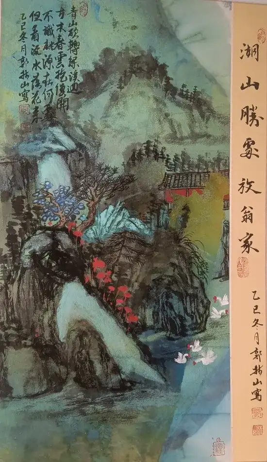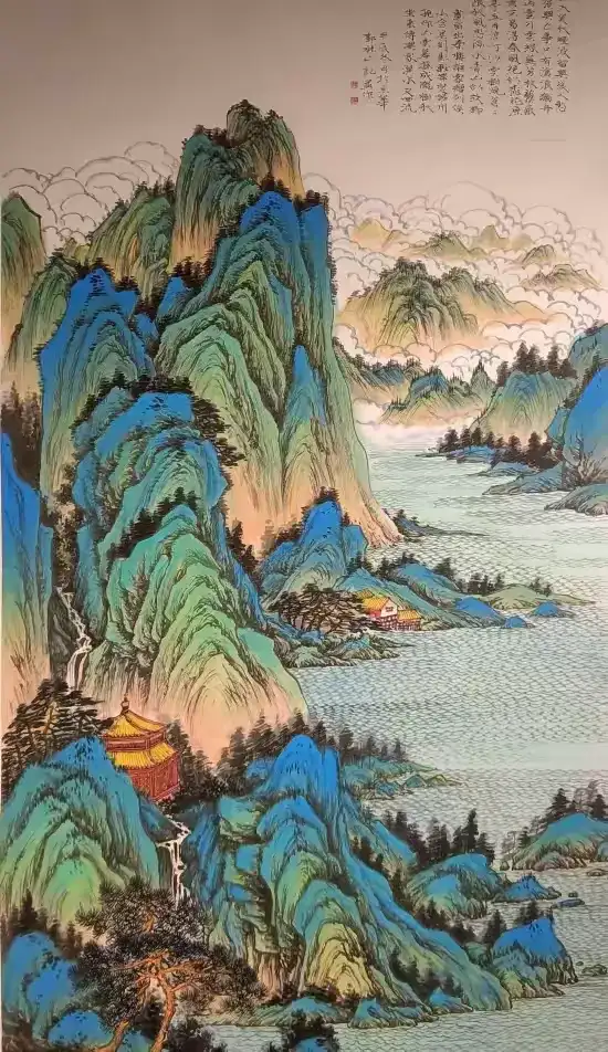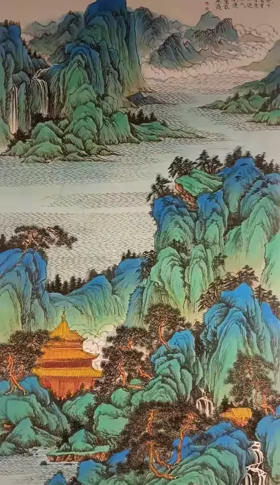 精品青绿系列:致敬传统又突破创新!《千里江山新韵》以宋代《千里江山图》为灵感,用现代技法重构青绿山水:近景亭台楼阁线条精细,远景山峦叠嶂气势恢宏,青绿颜料层层叠加却不厚重,尽显 “绿水青山” 的当代意境,完美诠释 “传统笔墨当代表达”。