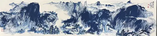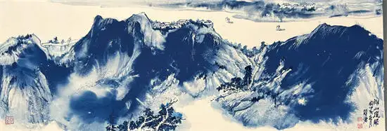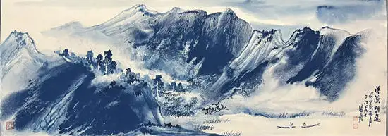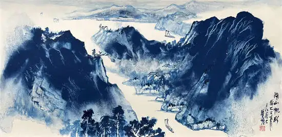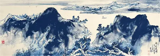 其拓展了传统绘画中用水用色对气韵生成的维度,融合传统水墨与现代技法。在中国现代山水画的创新表现中,水韵青花与黄宾虹的积墨、张大千的泼墨泼彩、李可染的逆光黑山白水及万山红遍的大面积朱砂运用等技法具有同等重要的艺术突破。