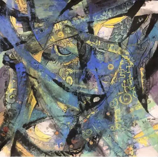 在画面语言的构建上,刘春晓展现出了出色的叙事能力与笔墨把控力。68×68cm的方形画幅,看似小巧,却被她营造成了一个兼具历史纵深与情感温度的艺术空间。他巧妙地运用青铜的青绿色调作为画面的主色调,斑驳的锈迹质感被转化为细腻的笔触,既还原了商代青铜文明的古朴厚重,又隐喻着历史的沧桑变迁。画面中,妇好的形象并非传统仕女画中的温婉柔美,而是带着一份巾帼不让须眉的刚毅与从容,她与武丁的对视,没有过多的缱绻缠绵,却在眼神交汇间流露出相濡以沫的默契。背景中,隐约可见的甲骨文纹路与青铜鼎的轮廓相互交织,将历史的符号融入画面,让每一处细节都成为历史的注脚。值得一提的是,刘春晓的环保主义理念并未在作品中直白呈现,而是化作一种含蓄的思考——青铜文明的传承,不仅是器物的留存,更是文化基因的延续,而当代人对历史文化的守护,恰如对生态环境的保护,皆是对文明根脉的珍视,这种将历史关怀与现实思考相融合的创作手法,让作品的内涵远超题材本身。