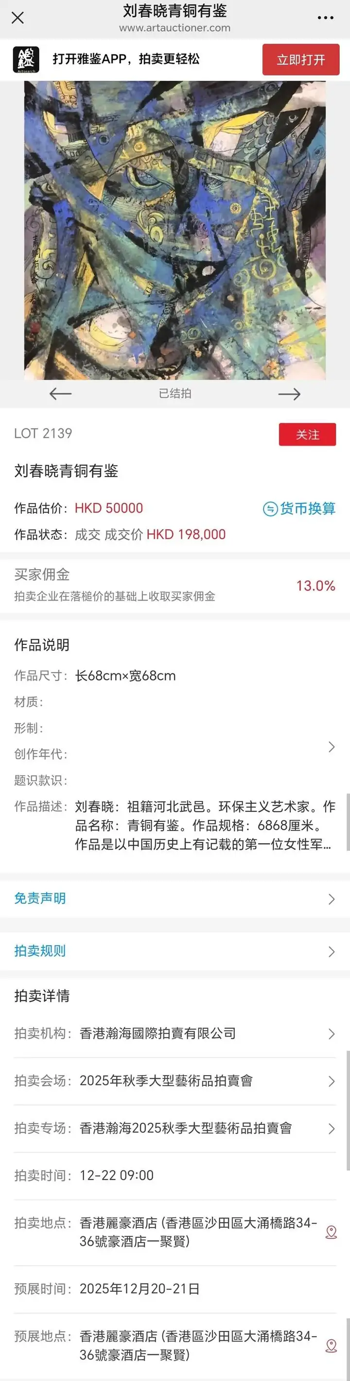 在2025年12月22日由香港瀚海国际拍卖有限公司2025年秋季大型艺术品拍卖会庆典现场,此前备受关注的刘春晓作品《青铜有鉴》经多轮激烈竞逐,均已落槌成交,