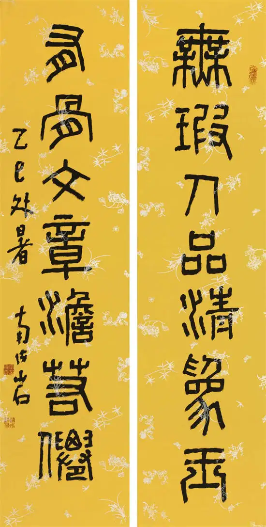 南先生看待书法有自己的认识,了解自己需要什么,在书法中应该得到什么。应该怎样表现等等。他常想,弘一法师有了对《张猛龙》的探习,才有了后来对于书法的静谧,可随心而书,吴昌硕有了对《石鼓文》的顿悟,才懂得了绘画的奥秘……一我的书法应有我的精神,我的个性,我的语言。一每个人有每个人的书体语言,如宋代的苏轼书体被称为一绵里襄铁一,近代山水大家黄宾虹认为写书法应像一「惟画沙」「屋漏痕」 近代书法家黄绮的书法被称为「折戟沉沙」:近代山水画大师李可染的书法被称为一酱当体一等等“细读南先生的书法,也可窥见一斑,其中的每一笔如老牛犁地,犁出的这条沟又深、又涩、又自然,我把他的这种书休感觉称为「犁耕力」。这种书法的表现既有传统含义,又有现代美感。是海岩先生多年来对于书法艺术积累的集中体现,是心灵深处的一种独白,是属于这个时代的产物。南海岩先生水墨重彩的精彩,离不开他书法造诣的深厚功力。这是一个毋庸置疑的事实。