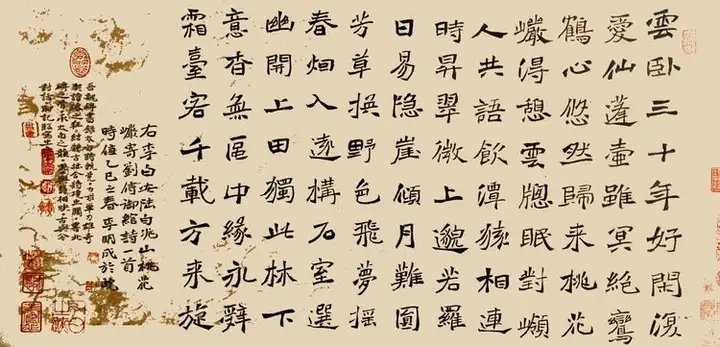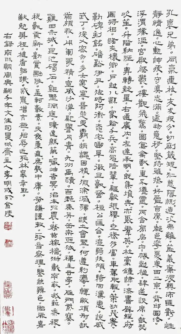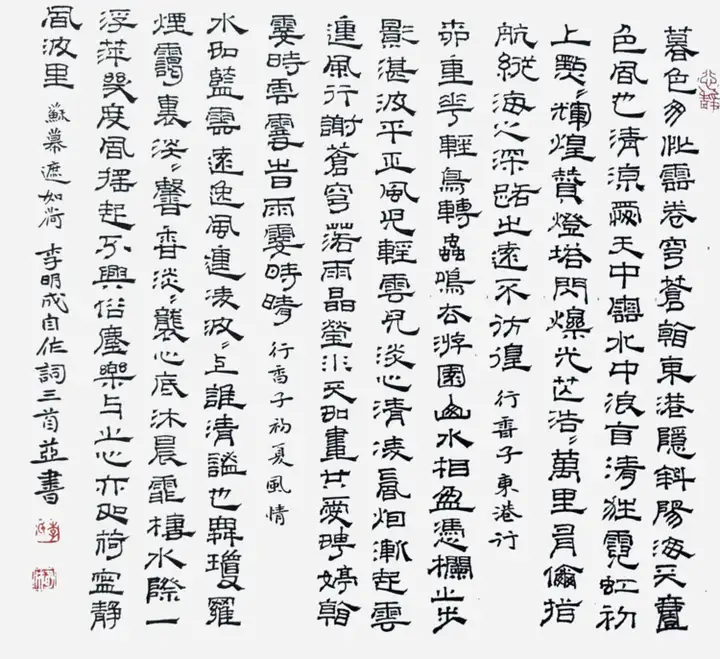 李明成:著名诗书画印全才型艺术家,祖籍安徽省来安县半塔镇,号江南居士,昊昕斋主人,紫砚草堂主人。先后攻读于滁州师专油画专业,南京艺术学院国画系,中央美院山水画专业。中国书协沈鹏书法创作班班长。现为中国书法家协会会员,中国收藏家协会会员,中国楹联协会会员,中国名人书画院副院长,北京南北书画院理事,2008年为北京奥运会书写2万余字百米长卷,现定居北京,从事书画创作,是一位在山水,花鸟,真草隶篆,小楷,小隶,篆刻,紫砂陶刻,油画,诗词,艺术评论等诸多方面均取得一定成绩的全才型职业书画家,被誉为当代小隶书第一人。许多代表作被海内外收藏界,国内私人美术馆,国家美术馆,中央档案馆,北京故宫博物院,中国文字博物馆等收藏。在北京,扬州,燕郊,无锡,北海,大连,半塔,天津均设有个人工作室。