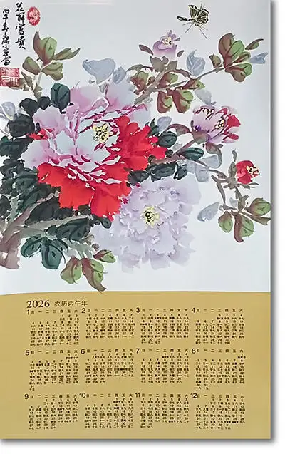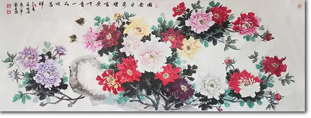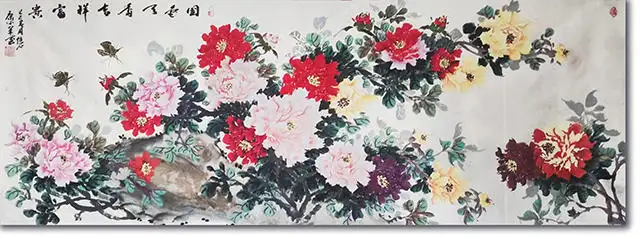 其作品是丝路风情与笔墨意趣的交融。尤其他笔下的牡丹,堪称一绝:红如烈焰、粉若云霞、紫似凝脂,色彩浓淡相宜却不失清雅,花瓣的层叠、枝叶的舒展皆灵动鲜活,蝴蝶翩跹于花丛间,更添生趣。无论是竖幅《吉祥如意》中牡丹的雍容独秀,还是长卷《国色天香吉祥富贵》里繁花的烂漫盛放,都尽显“清新、典雅、明快”的艺术特质,观之赏心悦目,仿佛能嗅到丝路大地上牡丹绽放的馥郁芬芳。这份笔墨功夫,既扎根于传统花鸟的写生技法,又融入了西北大地的豪迈气韵,让笔下花卉既有江南的婉约,更有塞北的热烈。