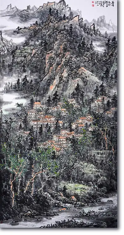 在笔墨意韵上,作品深植传统又不囿于古。师法吴昌硕、八大山人等名家,让其笔墨兼具金石的厚重与写意的空灵;荣宝斋画院的进修经历,又使其写生功底扎实,笔下山水并非闭门造车的臆想,而是十渡乡土山水的真实凝练,做到了“外师造化,中得心源”。水墨的晕染与色彩的铺陈相得益彰,既保留了中国山水画“澄怀味象”的精神追求,又贴合当代观众的审美感知,让传统山水在新时代有了鲜活的表达。