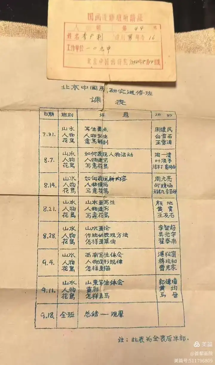 1960年初期成立叫(中国画研究会)汇聚了李可染、叶浅予、黄胄,白雪石,王雪涛,溥松窗,马晋等著名画家,成为创作核心基地。同期为发展国家级美术创作及文化传承同年开办了中国画研习班进行授课传授绘画技法,同年成立了山水,人物,动物,速写,等课程,学生有李广利启功等。