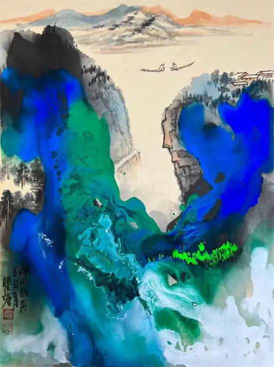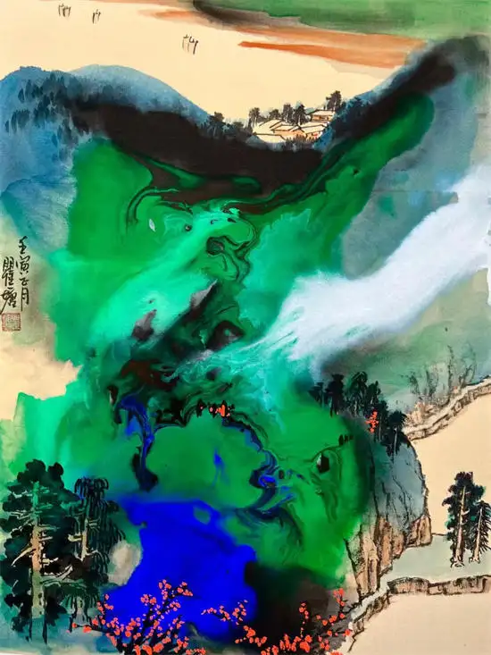 “重彩泼墨泼彩山水画”“泼彩山水”技法为代表,融合了传统泼墨大写意与浓烈青绿重彩的现代中国山水画风格。它注重色墨交融、气势磅礴,既有传统意境,又极具现代视觉张力。