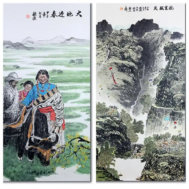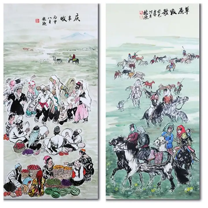霍振源的创作题材与情感表达高度统一,始终锚定“歌颂党、歌颂祖国、歌颂人民”的核心。《军民鱼水情》以纪念抗战胜利70周年为契机,用热烈的红绸、欢腾的人群勾勒出军民同心的动人场景,炮火后的欢庆里,藏着他对革命胜利的珍视;《没有共产党就没有新中国》则以三层画面的强烈对比,将旧中国的黑暗、革命战士的浴血奋战与新中国的光明并置,直白的题字与极具张力的笔墨,把“党带领人民走出苦难”的切身感悟化作视觉冲击;而《大地迎春》《草原牧歌》《庆丰收》等作品,又将视角投向新时代的民族生活,藏族同胞的笑颜、草原上奔腾的骏马、新疆人民欢庆丰收的歌舞,皆是他眼中“幸福生活”的具象化表达,从民族交融到民生安乐,每一笔都描绘着新中国带来的美好图景。