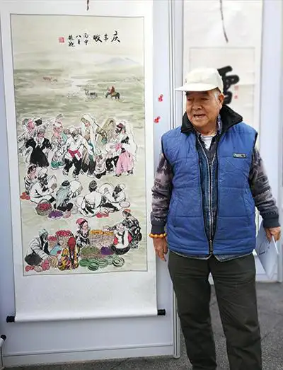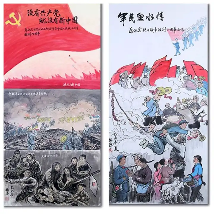 他的艺术之路并无科班深造的经历,自幼的书画爱好,退休后在社区书画班的深耕,让他的笔墨少了学院派的雕琢,多了民间创作的质朴与真诚。作为航空系统的退休职工,从以工代干做封面设计到成为书画协会的会员、评委与讲师,他的创作始终扎根生活、源于真情。没有繁复的技法炫技,也无晦涩的艺术隐喻,他用直白的构图、浓烈的色彩、生动的人物群像,让情感成为作品的灵魂——对旧中国苦难的痛惜,对革命先烈的敬仰,对党的感恩,对新时代的热爱,都化作笔下的线条与色彩,朴素却真挚,简单却动人。