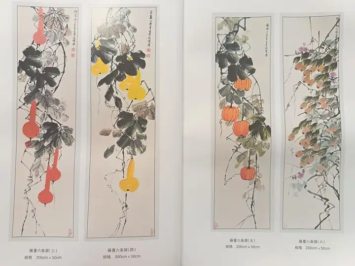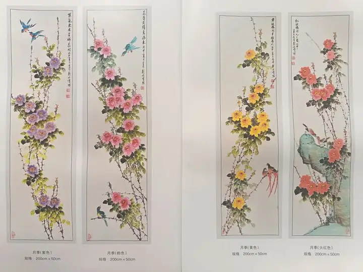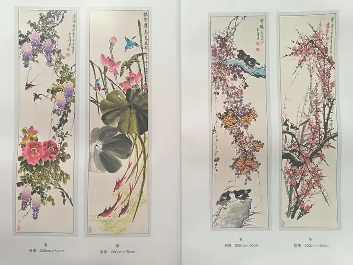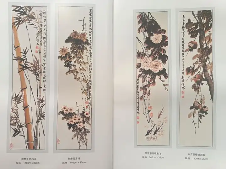 除了震撼人心的长卷作品,刘晓贤的条屏系列同样堪称佳作。6尺对开12条屏《百花齐放》,将四季花卉的千姿百态尽数展现,春梅的傲骨、夏荷的清雅、秋菊的隐逸、冬梅的坚韧,在笔墨流转间次第绽放,仿佛能嗅到花香满溢,听见蜂蝶嗡鸣;《陕西的水果8条屏》与《陕西的鸟8条屏》则充满浓郁的地域风情,石榴的饱满、苹果的圆润、柿子的红火,配以朱鹮的翩跹、喜鹊的灵动、百灵的娇俏,既是对家乡风物的深情礼赞,也是对自然生灵的诗意描摹;而多套春夏秋冬4条屏,更是以凝练的笔墨捕捉四季更迭的神韵,春之明媚、夏之繁茂、秋之绚烂、冬之静谧,皆在尺幅之间流转,尽显艺术家对生活的敏锐洞察与对笔墨的娴熟掌控。