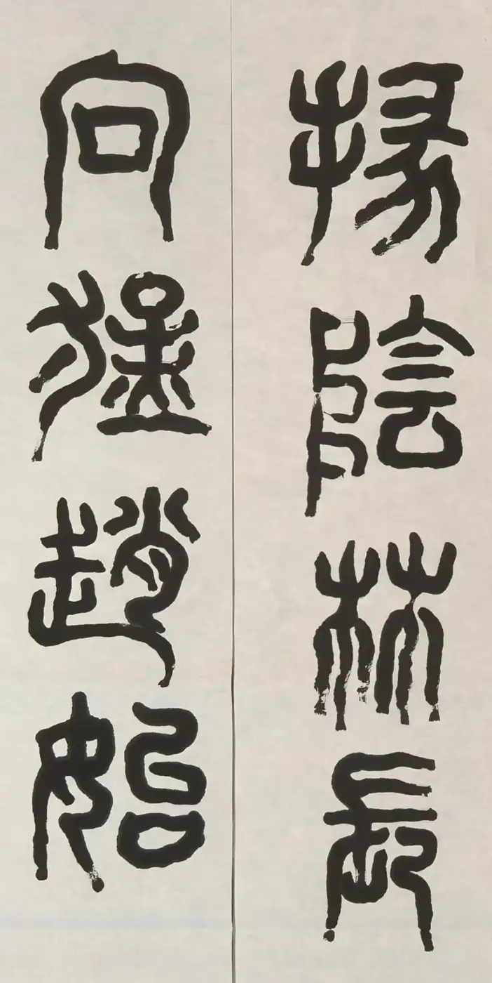 聆听“金气石气”:世人观书多用眼,我则主张“若用眼观终难懂,耳处辨书方得知”。篆籀笔法内含“金气四象”(清若洗月、远如渡云、沉同雷音、亮比电裂)与“石气三劫”(裂痛、蚀痒、冻噤)。临写时,需用耳谛听:笔锋与纸的摩擦,可是刻石之声?墨渖的聚散,可有熔铜之韵?飞白之处,是否传来风蚀千年般的幽鸣?如此,方能接通线条背后的生命律动。