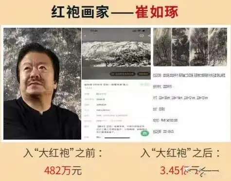 在艺术市场上“大红袍作品”相比一般作品价格高出几倍到几十倍,凡是能够入选大红袍艺术家的,其作品无一不在市场上拍出天价,很多画家在进入“红袍画家”之后,屡创价值神话。