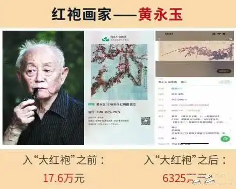 著名画家黄永玉,入选“大红袍”之前,其作品价值不到百万,1999年入选之后,其作品拍卖价格连破百万、千万,其作品《田家梅》成交价6325万元,作品涨幅35937%。