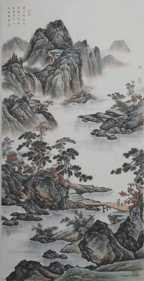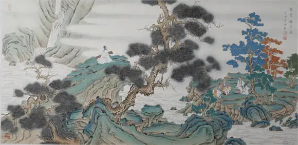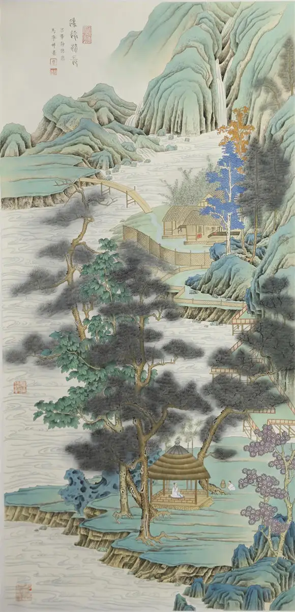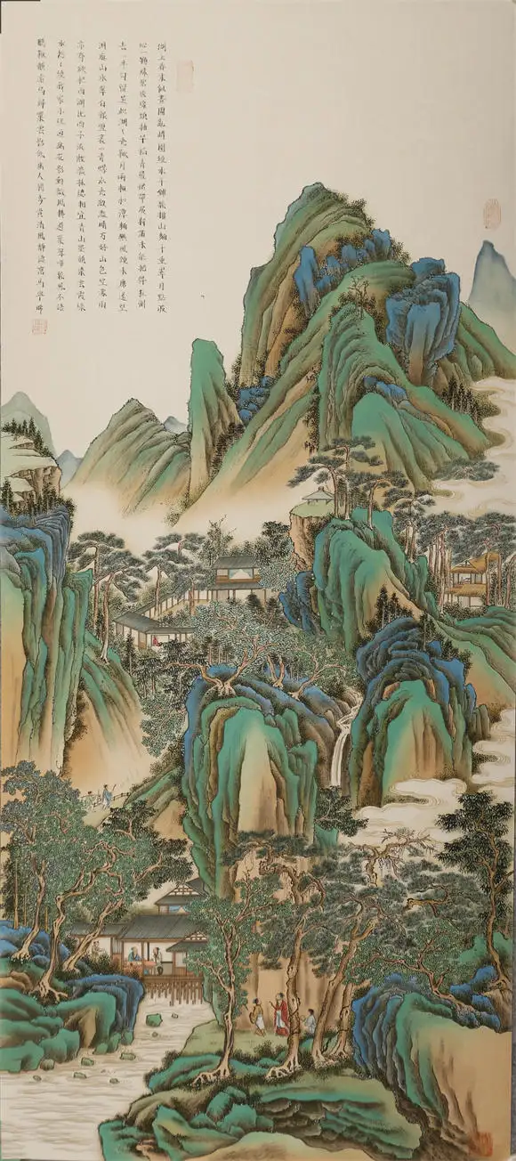 青绿山水加高士系列更是将传统技法的表现力推向极致,传统皴法,加以矿物用色,瀑布的飞白与云雾的渲染形成虚实对比,诠释了中国山水画 “三远法” 的空间智慧;人物形成叙事点,层次过渡自然,打破大面积青绿的单调,密不透风,疏而不漏,亭台严谨,人物动态、衣纹、神态生动传神,色彩古雅协调,意境鲜明,是传统文人画的经典题材,表达文人避世归隐、寄情山水的精神追求。