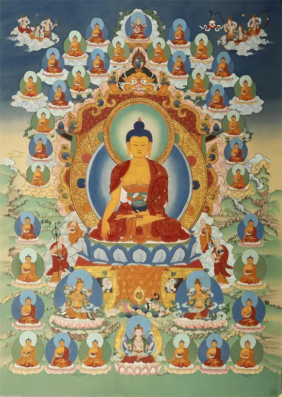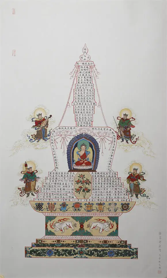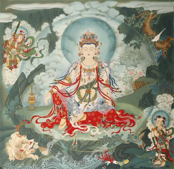 在《唐卡佛造像》中,马宁晞恪守唐卡 “三经一疏” 的绘制仪轨,以金粉勾线、石青石绿朱砂填色,佛造像的璎珞衣纹用 “游丝描” 精细勾勒,莲台祥云的三矾九染,既保留了藏地唐卡庄严神圣的宗教特质,又通过矿物颜料的层次叠加,让佛像的光影质感更具现代视觉张力。
