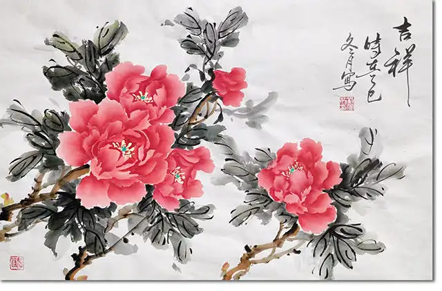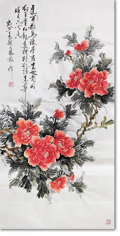 那朵朵红牡丹,如天边落霞,似晚来星火,在浓淡有致的墨叶间热烈地盛放。花瓣的层次晕染自然,从内到外透着一股未经雕琢的鲜活生气。墨色的叶片用老辣的笔触勾勒,与娇艳的花朵形成刚柔并济的对比。