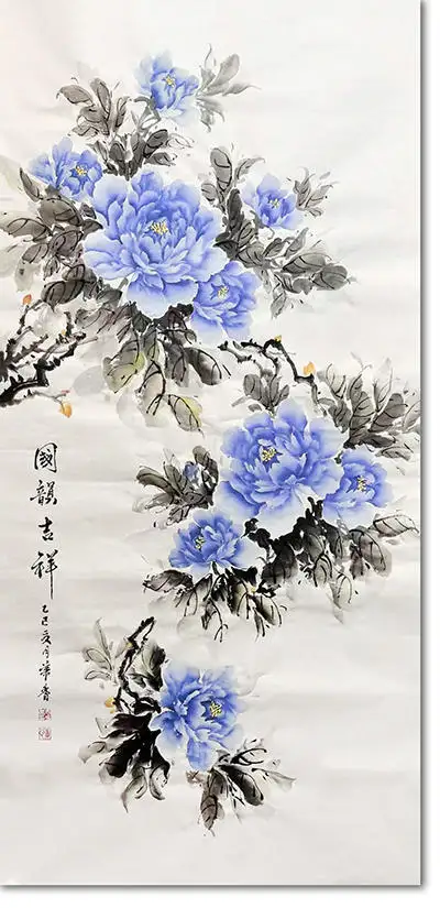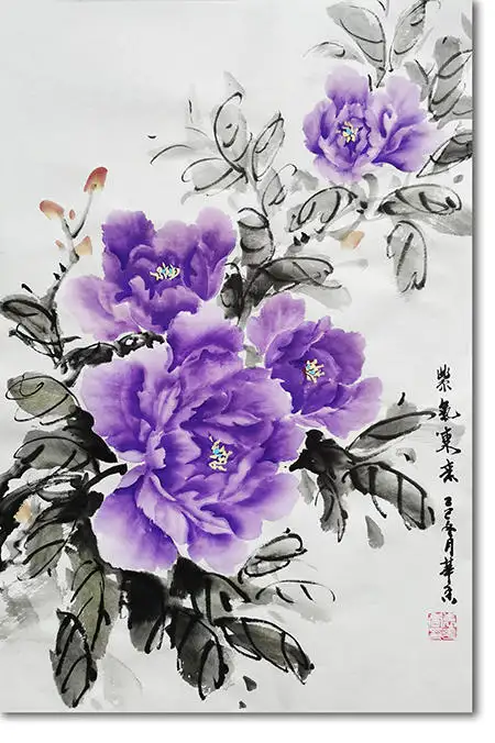 画面中,几朵紫牡丹如轻纱般舒展,层层叠叠的花瓣在水墨的氤氲中晕染出梦幻的光泽。那紫,不是浓艳的华贵,而是带着一丝清冷的、沉淀了岁月的雅致。叶片用浓淡干湿的墨色勾勒,笔力遒劲,与柔美的花瓣形成鲜明对比,刚柔并济间,尽显风骨。