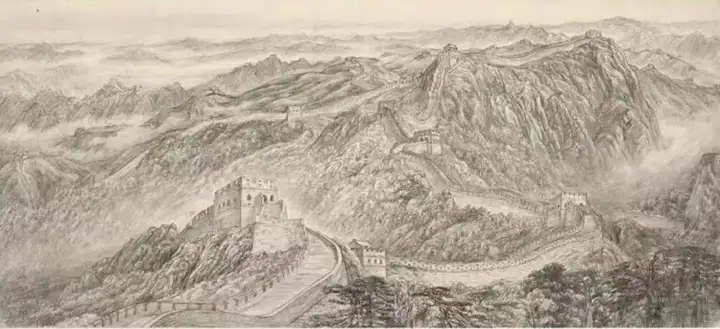回到北京,张鲁把写生的强烈感受和对长城精神内涵的深刻理解画成多幅草图。在第一稿中,张鲁着力强调万里长城史诗般的宏大场面。从山海关到嘉峪关,咫尺千里,万里长城尽收眼底,长城长、险、势的特征得以鲜明地展现。