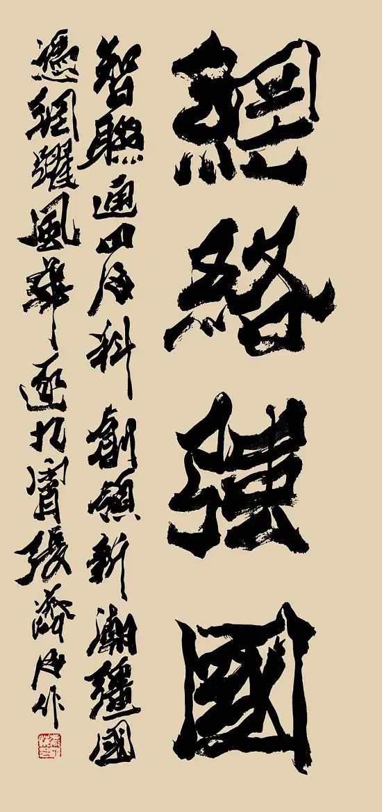 这件136×68cm的宣纸作品,是张济海近年力作。他以独创的爨八体书写“网络强国”四字,融《爨宝子碑》古拙、《爨龙颜碑》雄健于一体,兼纳篆隶圆劲与行草灵动,旁题自作诗以行草辅之,将时代主题与传统书法完美融合,笔墨间尽显苍劲豪迈的艺术气质。作为当代碑学创新标杆,张济海的爨八体融合八种书体精髓,被收录入新版《中国书法大字典》,其《厚德载物》《中国龙》等作品早已成为中华文化对外传播符号。此次《网络强国》吸引多国藏家竞价,彰显国际对其艺术价值的认可。