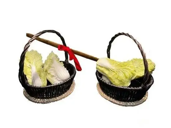 此玉雕以扁担挑双筐为形,筐中嵌岫玉雕琢的白菜,玉料青白相间,白菜形态鲜活,菜叶的纹理、菜帮的莹润都刻画得惟妙惟肖;扁担系红绸的细节点缀,更添喜庆氛围。
