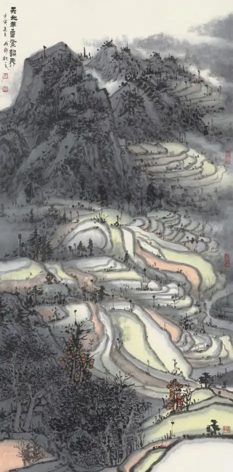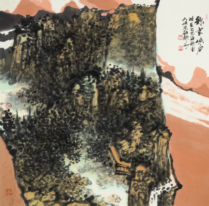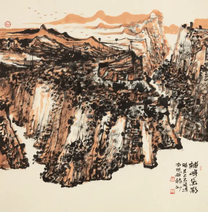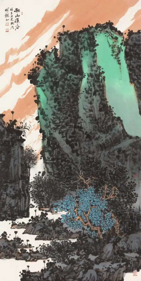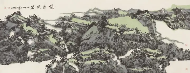 回观群龙先生《山水清音》、《山色正衿秋》、《厚土脊梁》、《圣地家山》、《山外云峰》等作品中对色彩也是大胆豪横的运用,丝豪没有犹豫不决,天空不再是白的和蓝的,多了绿的,红的,黄的等等。加上其穿插的色彩块面有大的、中的、小的和不规则的均独具意匠设计,利用丰富的色彩层次和对比关系,营造出了非常雅致的色彩品格,蕴含了这个斑斓多彩的客观世界,而又有强烈的艺术效果,增添画面无限的艺术生命力和时代感。