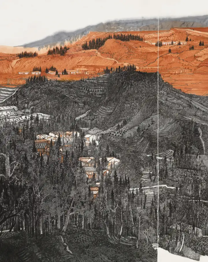 纵观历史,庄子的道家思想占据了中国绘画精神的主导地位。自六朝以来,经唐、宋、元、明、清,中国画家一直延续着与自然为伍、其素材来源于自然而又并非照搬自然。群龙先生的作品《太行人家》、《山水祥和》、《秋山物语》、《千峰寺写生》、《墨润山川》等都是从写生中来的,表达着他对自然山水的一种情结,是一种身心自由的释放,他的作品有一种大自然的静气,有一种无形的定力。见画见人可见心,可见他在对景创作时的心境一定是非常安静平和的,他能非常巧妙的把自然信息转换成艺术信息是一种精气神的追求表达,这种静气能给人一种与世无争而明志的精神享受。