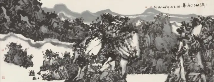 自宋代苏轼提倡文人画后,中国画讲求诗、书、画、印四位一体的构图布局,使得作品达到可观、可读、可品的特点。而当代山水画作品的构图,如群龙先生的《山外云峰》、《云过家山便是客》、《千山秋韵》、《楚水流香》、《春醉巴陵晴空晓》、《夕照亭台坐翠微》等作品更讲究平面构成,更注重块面和平面的表达,更注重处理黑白灰的艺术关系,更注重点、线、形的关系结合,更多的从方形、圆形、三角形、多边形和不规则形中找到不同的表现形态,而又能相互融合在一个完美的构图中,这是一种大胆的尝试,很具特色。我想这应该是每一个画家应该去深入地研究、探索、发展的一种方向。在表现形式与视觉内涵上既千变万化又能融汇归一。