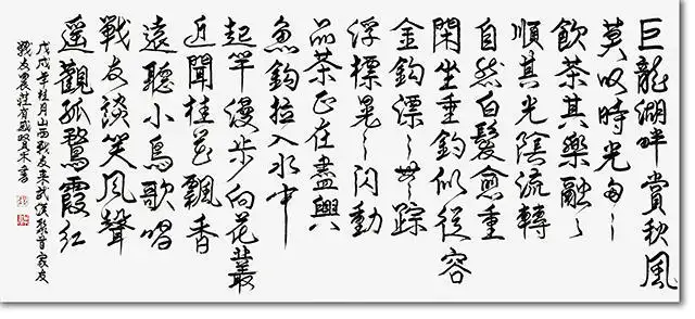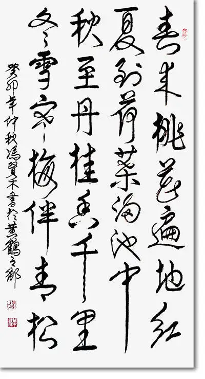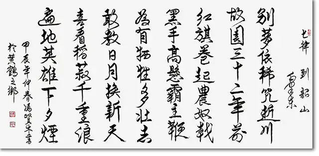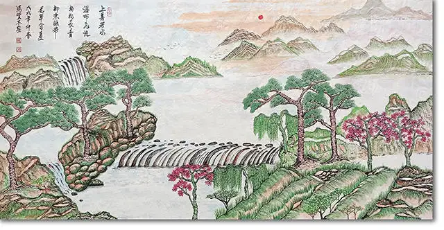 更重要的是,其作品打通了“自然山水”与“文化文旅”的边界。冯贤木的创作并非停留在山水形貌的复刻,而是融入时代语境下的文旅精神——画面里“绿水青山”的主题表达,呼应着当下文旅发展中“生态+文化”的核心导向;题跋中兼具诗意与时代感的文字,让山水不止是视觉符号,更成为承载地域文化、红色记忆、民俗风情的载体。比如其作品中隐含的荆楚人文脉络,或是对“红色之旅”等文旅主题的艺术呼应,让青绿山水成为文旅叙事的视觉载体:当文旅产业以自然景观为基底挖掘文化内涵时,冯贤木的笔墨则反向将文化内涵凝练成可感知的山水意象,让文旅的“文化魂”与山水的“自然形”相互赋能。