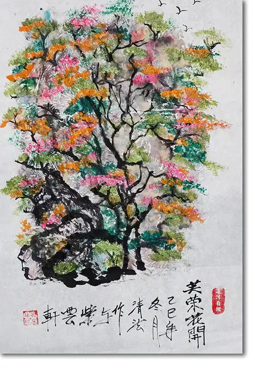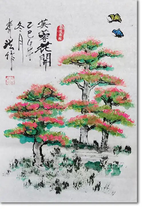 从题材择取来看,道家以自然为“道”的具象显现,主张“天地有大美而不言”,孔庆珠的创作始终锚定自然本真的物象,《芙蓉花开》中虬曲的古树、盛放的繁花、翩跹的蝶鸟,皆取材于天地间自在生长的生命形态,摒弃了世俗功利的物象雕琢,直抵自然美学的核心。画中的古树并非人工修剪的园林盆景,而是山野间历经风霜的自然之木,枝干苍劲却不失灵动,尽显生命的本真状态;芙蓉花并非刻意培育的名贵品种,而是在自然时序中肆意绽放的繁花,粉艳的花瓣与翠绿的枝叶相映,流露着生命的蓬勃生机;蝴蝶振翅于花枝之上,无拘无束的姿态更是自然生命逍遥本真的写照。这些自然意象的选取,并非单纯的写生摹画,而是画家对道家“人法地,地法天,天法道,道法自然”理念的艺术践行,将自然万物视为“道”的外化,以笔墨捕捉自然本真之美,让画作成为对自然大道的直观诠释。