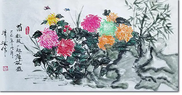 于意境营造而言,道家“天人合一”的宇宙观是孔庆珠画作的灵魂脉络。《芙蓉花开》中,古树与繁花相融相生,蝶鸟与花木彼此呼应,自然物象并非孤立存在的个体,而是构成了一个有机共生的整体,展现出人与自然、万物与天地的和谐交融。画中题款旁的“道法自然”印章,更是直接将道家的精神内核与画面意境相联结,让观者在欣赏笔墨形态的同时,能感受到“天地与我并生,而万物与我为一”的精神境界。画家以笔墨为媒介,打破了人与自然的界限,将自身的精神情感融入自然物象之中,使画作成为心与物、人与道相通的桥梁,这种意境的营造,不仅是对传统花鸟画“意境为上”审美追求的传承,更是对道家天人合一思想的深度诠释。