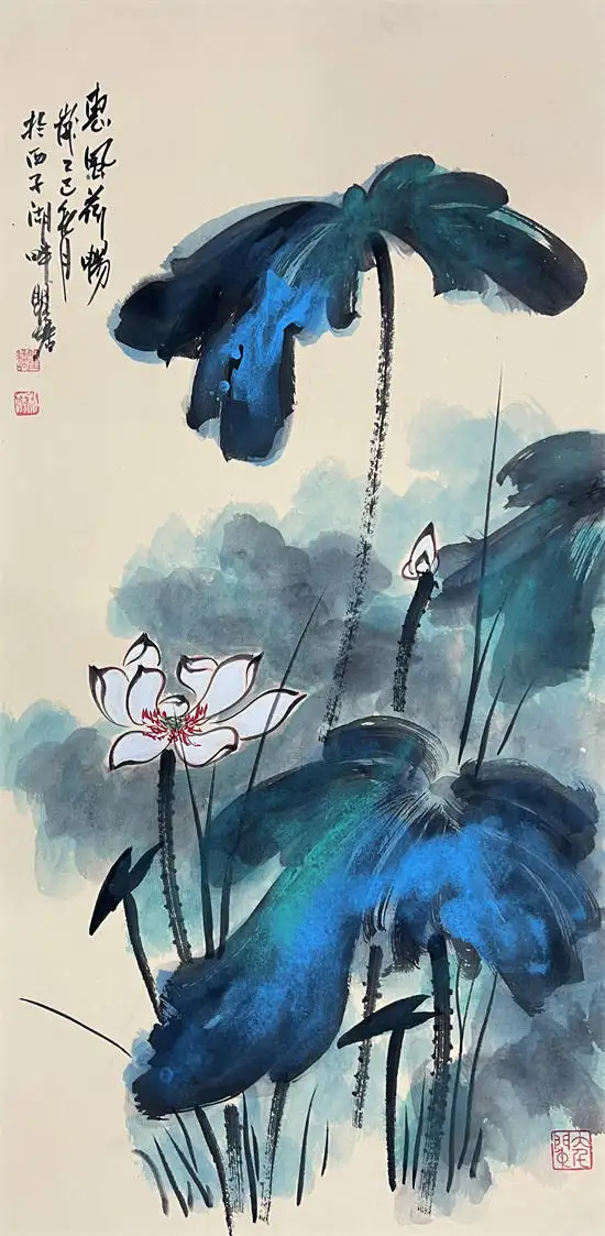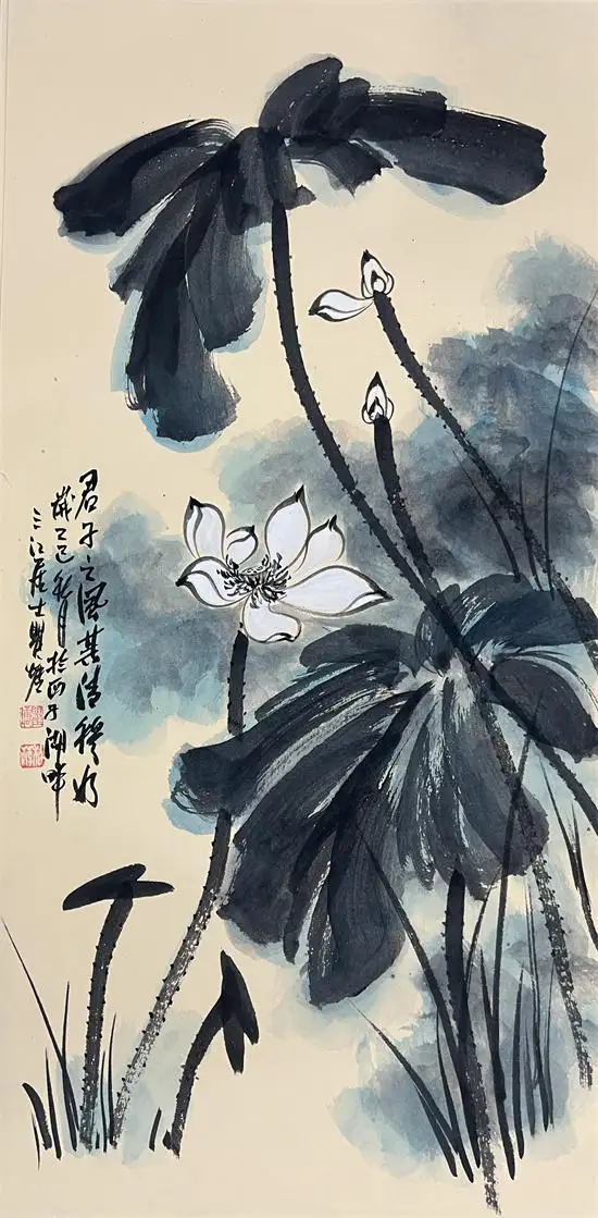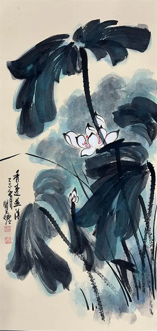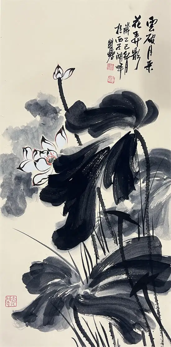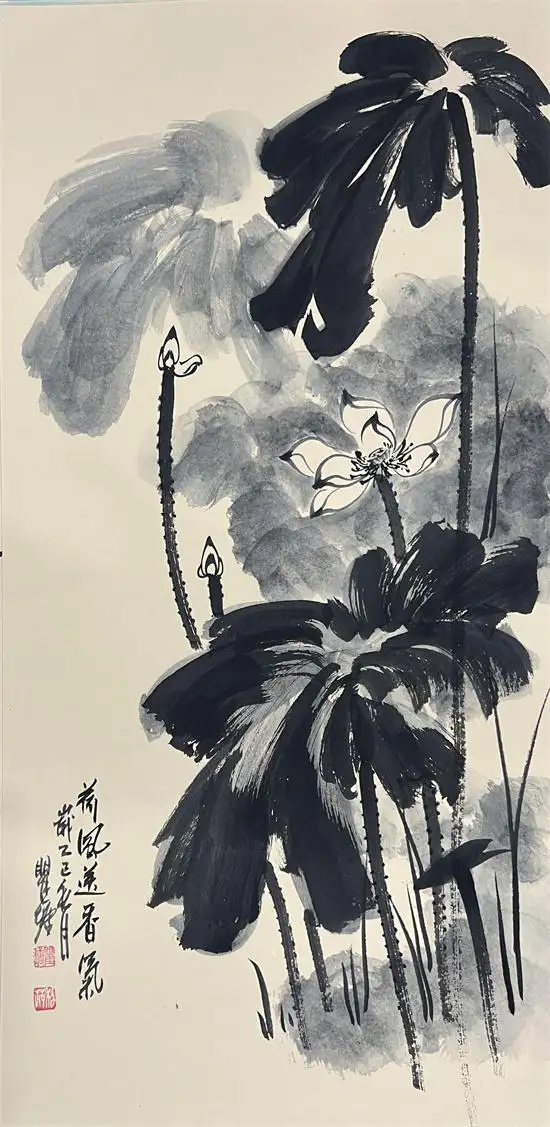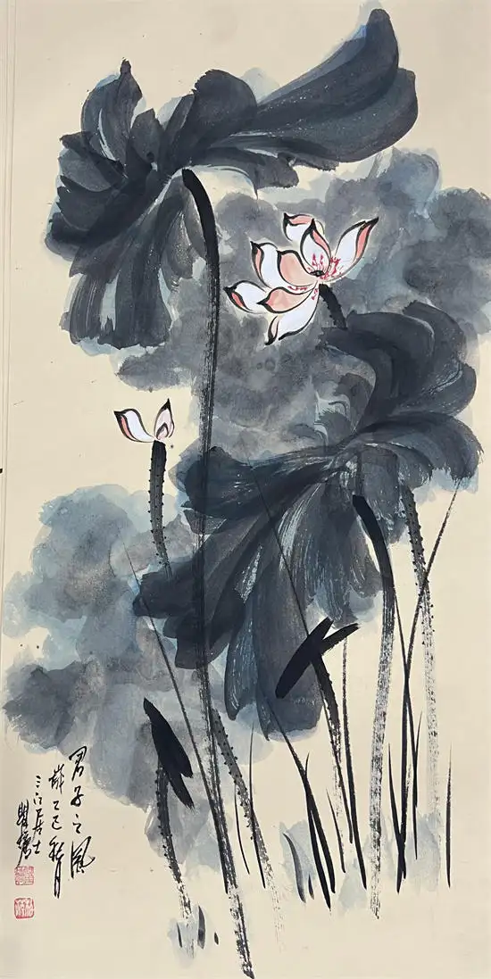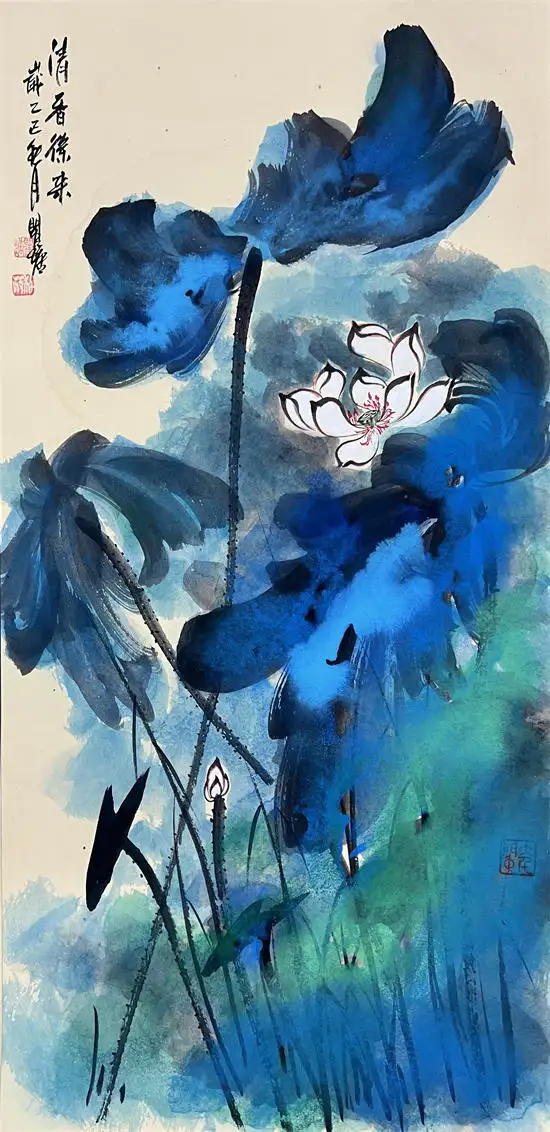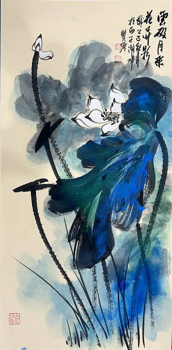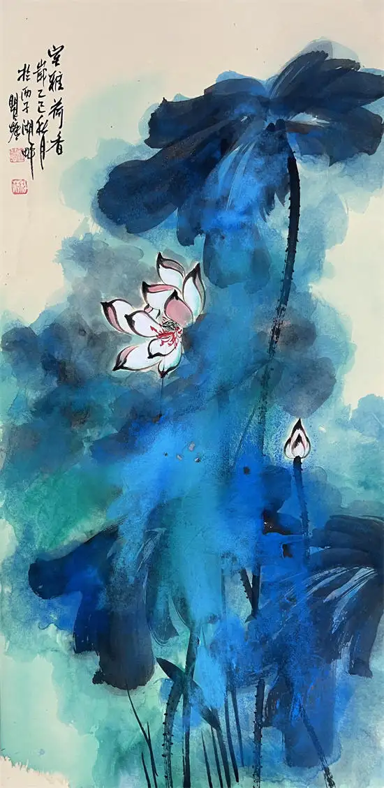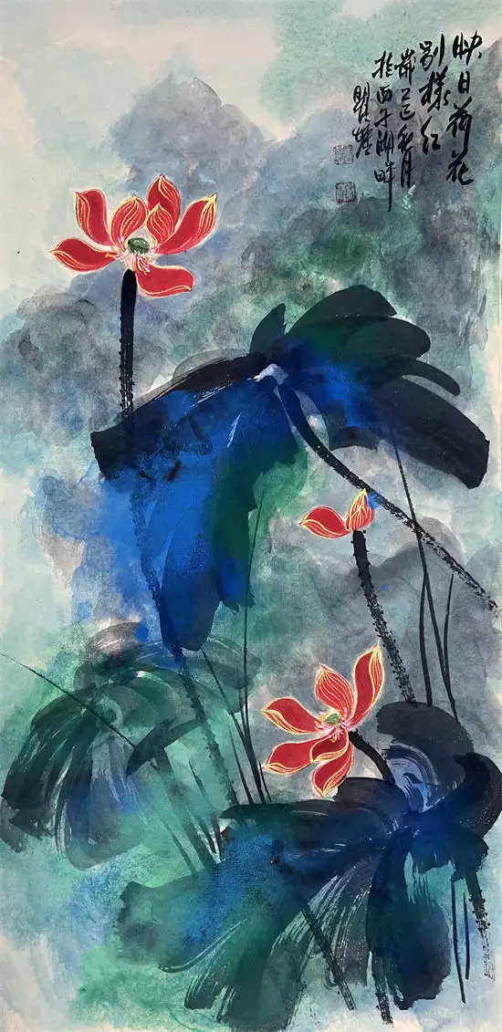 荷花寓意高洁、典雅,代表了真、善、美,象征出污泥而不染的的人品,象征着与朋友之间深厚的友情,因而成为古往今来诗人墨客歌咏绘画经久不衰的题材。画家瞿塘泼墨泼彩荷花传承了先辈张大千的基础上融合了中国传统水墨技法与西方现代抽象艺术元素的创新绘画风格,这种风格以大胆、自由的泼洒手法为特征,打破了传统工笔或写意荷花的细腻勾勒模式,强调色彩与墨韵的自然交融与偶然效果,从而赋予荷花题材更强的视觉冲击力和情感表达力。虽技法奔放,但并非无序。画家往往通过长期观察荷花的生长形态与精神气质,将“出淤泥而不染”的高洁、风过荷动的灵动等意象融入其中,使作品在豪放中见精微,于混沌中显神韵。