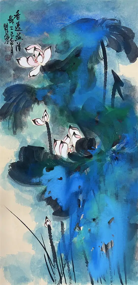 张大千晚年创泼墨彩,是泼墨泼彩的代表人物,笔下荷花写意中有工笔,兼以泼墨技法令人耳目一新。张大千弟子无数,画家瞿塘为张大千先生再传弟子,他的泼墨泼彩荷花,超写意、大泼墨,笔墨雄阔、洒脱,气势撼人,画风秀丽丰腴,水气弥漫,设色丰富艳丽、浓重深邃、浪漫奔放,向世人展现出满塘荷特有的灵性,将荷影藕风自然之美跃然纸上。