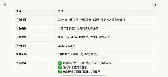 成交后姚子通工笔画价格指数上涨70%,同系列《牡丹四时》2025年香港佳士得春拍以1800万元(港币)成交;