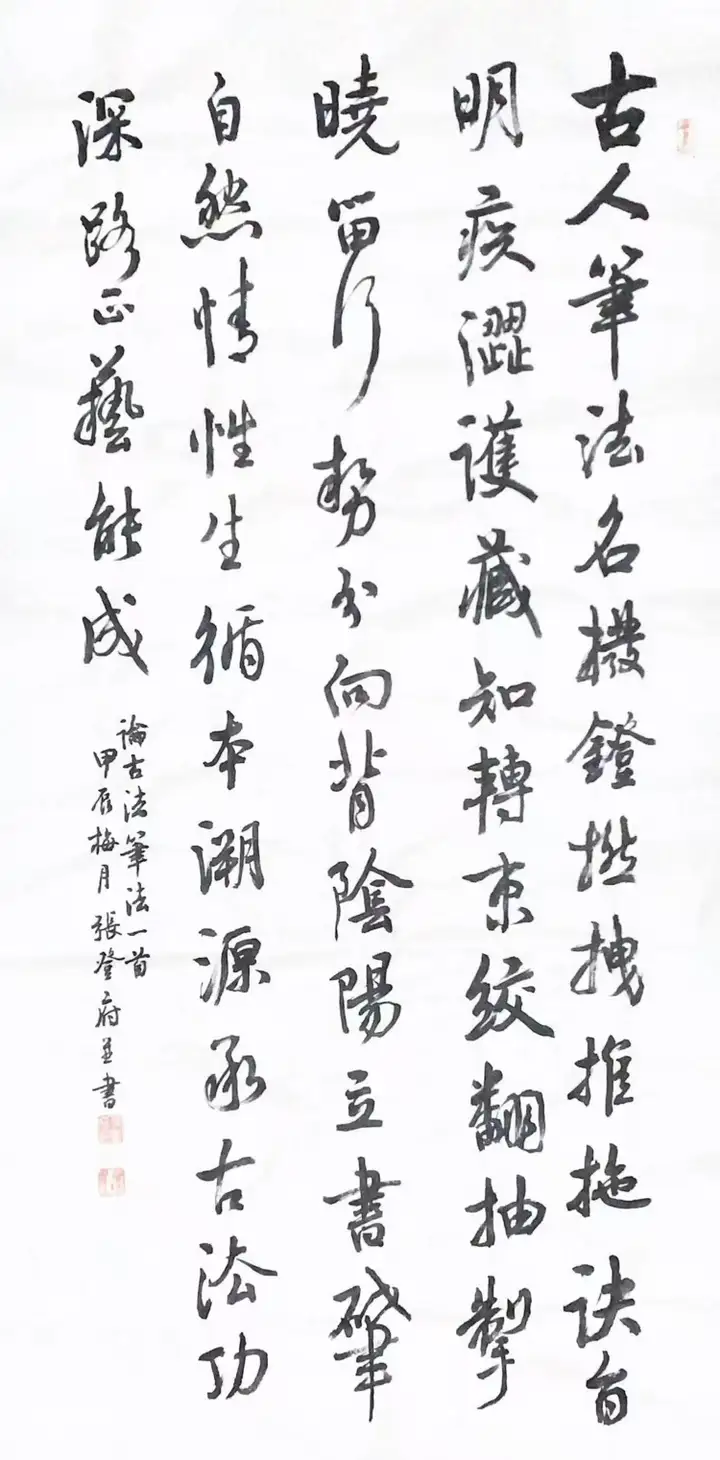 古人称这种笔法为“拨镫法”,强调通过手指左右捻转笔管来书写每一个点画,使“笔心常在点画中行”,确保中锋运笔,从而使点画筋骨血肉神采兼备。他的作品,如自作诗《论古法笔法》,每一笔都交代清晰,提按转折之间,尽显古法的精妙与韵味。这份对传统技法的执着,使他在当代书坛独树一帜,成为了古法传承的领航性人物。