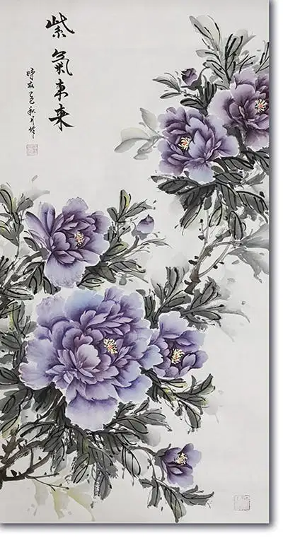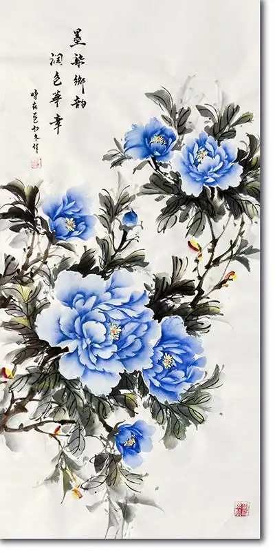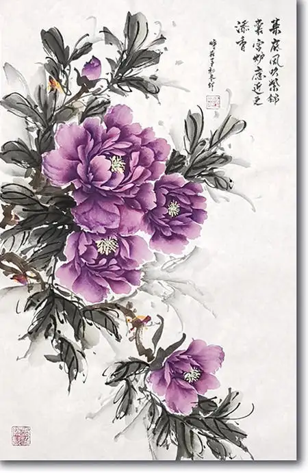 王丽丽的牡丹画,既深植于"会派牡丹"的艺术精髓,又彰显出鲜明的个人风格。她笔下的花朵,无论是娇艳欲滴的粉红,还是神秘高贵的紫蓝,都洋溢着一种蓬勃向上的生命力。她用灵动的笔触,勾勒出牡丹花瓣的层次与质感,用浓淡相宜的色彩,渲染出花朵的神韵与气质。每一朵盛开的牡丹,都仿佛在诉说着一个关于生命绽放的故事,传递着积极向上的人生态度。 她的作品《国色朝酣酒,天香夜染衣》,将牡丹的"国色天香"描绘得淋漓尽致。画中,几朵粉红的牡丹在墨色淋漓的枝叶衬托下,显得格外娇艳动人。花瓣的晕染自然流畅,色彩过渡柔和,仿佛能让人闻到那淡淡的花香。这幅作品不仅展现了她扎实的绘画功底,更体现了她对传统文化的深刻理解与传承。