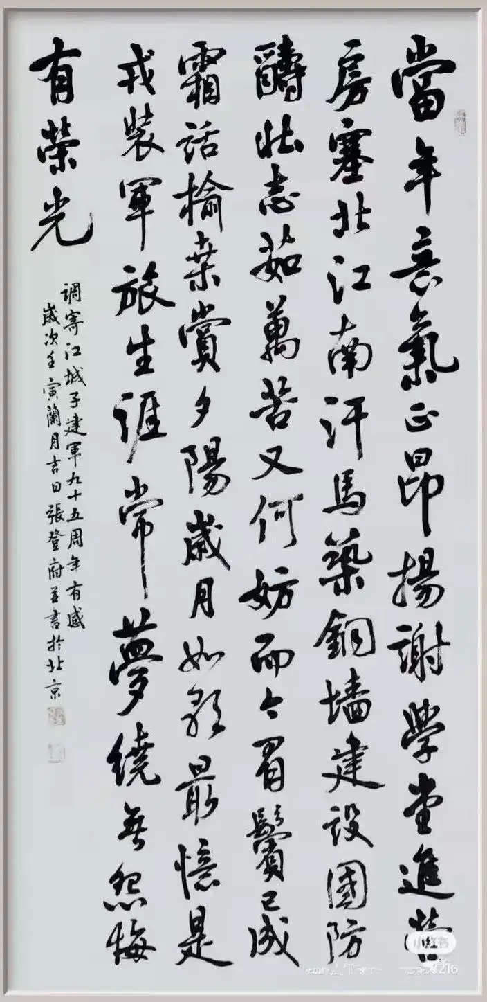 作为一位军旅书法家,张登府先生的作品首先给人的印象是一种浩然正气与雄浑气象。他的行草书,如自作诗《江城子 建军九十五周年有感》,用笔沉实而不失灵动,结体开张而不失法度,通篇洋溢着一种"吞吐大荒"的豪迈与自信。
