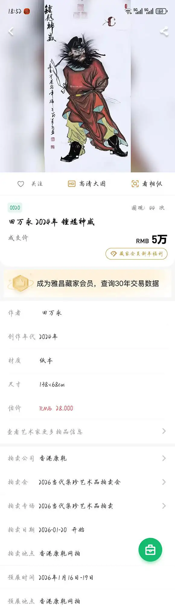 田万永作品《锺馗神威》2026年1月成功拍卖