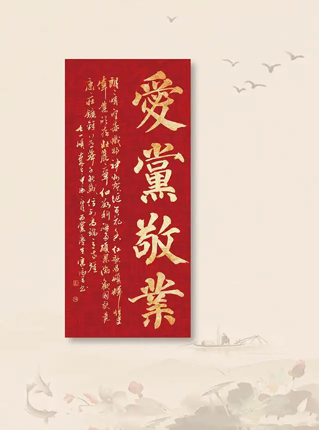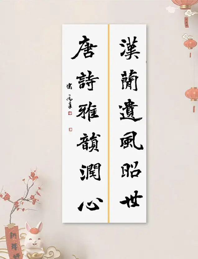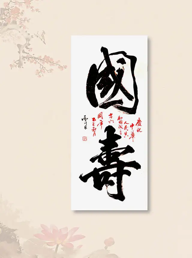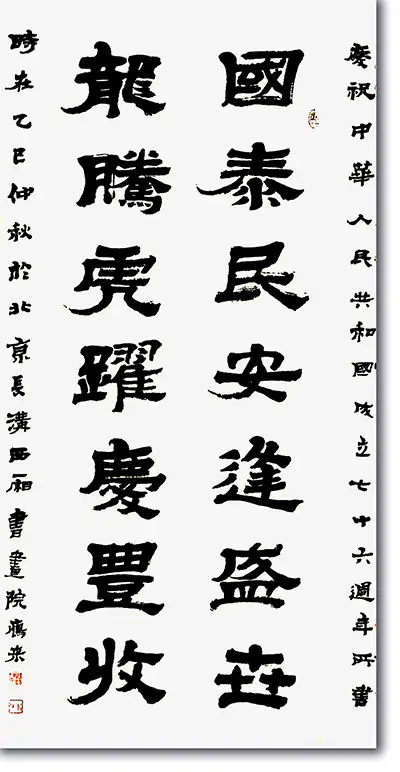 其书法,是岁月磨洗后的刚劲与灵动。三十年研习历代碑帖,以古为师的积淀,让他的笔墨兼具传统底蕴与时代气息。抗疫期间挥就的“铁肩担道义,热血谱华章”,笔法刚劲有力、浑然天成,字里行间尽显家国情怀与民族气魄;“汉简遗风昭世,唐诗雅韵润心”的楹联,笔墨间融汉简的古朴与唐诗的雅致,意境悠远;庆国庆所作“国寿”榜书与“国泰民安逢盛世,龙腾虎跃庆丰收”联句,更是将时代盛景凝于笔墨,大气磅礴的笔触勾勒出民族的精神气象,尽显榜书艺术的雄浑之美。