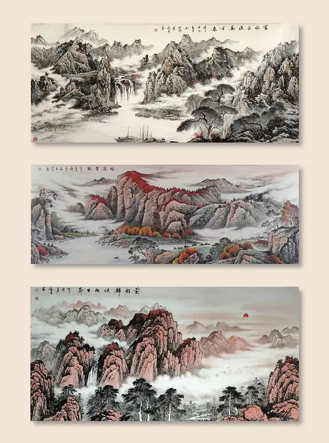 其绘画,尤擅山水,亦工花鸟,于传统中求新变,自成一格。山水画意境古厚、大气磅礴,《鸿运当头》层岩叠嶂间云霞漫卷,丹枫映翠,予人身临其境的沉浸感;《前程锦绣旭日升》以黄山奇峰为景,云海翻涌伴红日初升,笔意流畅间尽展山河壮阔;《富水长流万古长》则借飞瀑流泉、苍松叠嶂,绘就自然灵秀与古韵悠长。他秉持“写生必先敛浮气,待意思静专”的创作理念,笔下花鸟惟妙惟肖、栩栩如生,既得自然神明之妙,又合造化生息之意,于笔墨流转间绽放鲜活生机。