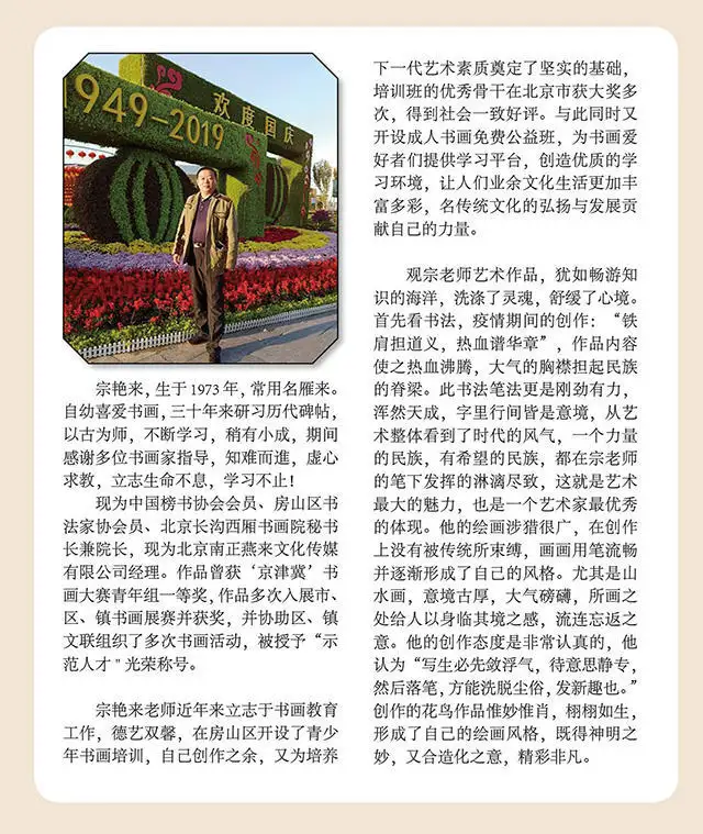 房山大地钟灵毓秀,孕育出诸多艺苑英才,宗艳来(雁来)便是其中熠熠生辉的一位。生于1973年的他,以三十载翰墨耕耘,将对书画艺术的赤诚,熔铸于笔端纸间,既成个人艺术风貌,更以教育之心为乡土文脉传承播撒薪火。