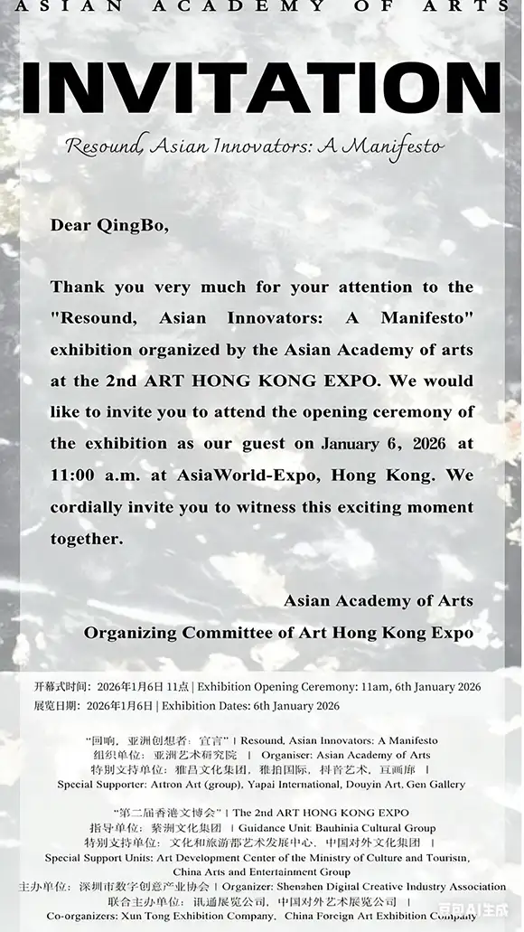 2026年1月,画家清波受邀参加由亚洲艺术学院(Asian Academy of Arts)主办的学术展览——“Resound, Asian Innovators: A Manifesto(回响·亚洲创作者:宣言)”,并作为特邀艺术家出席展览开幕仪式。该展览于第二届 ART HONG KONG EXPO期间,在香港亚洲国际博览馆(AsiaWorld-Expo)正式亮相。