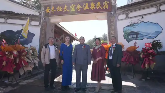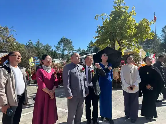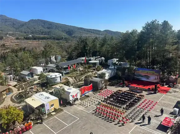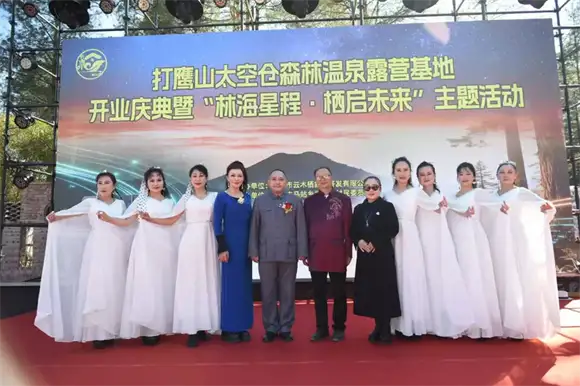 庆典现场彩旗飘扬,20余亩山野间,21座银色太空舱如星舰泊林,木质别墅掩映在松涛之中,与远处的火山群构成一幅自然与现代交织的画卷。腾冲市文化和旅游局、投资促进局领导,马站乡、村负责人,以及中国梦伟人艺术团团长黄忠阳、国家级玉雕大师杨树明等36位各界嘉宾出席仪式,北京资深职业经理人,中国第二届品牌论坛副秘书长,腾冲旅居人俱乐部常务副会长兼秘书长王莘女士受中国女企业家协会副会长,北京市朝阳区女企业家协会会长委托宣读她亲笔贺辞,祝北京企业家来腾冲文化交融和事业开拓马到成功!并盛赞基地“为乡村文旅注入创新活力”。