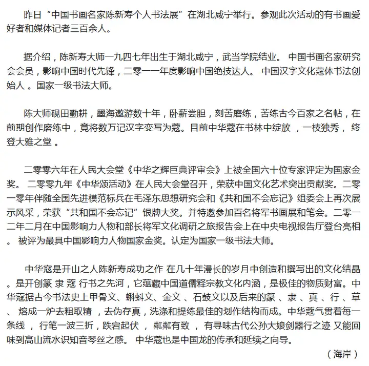 中国书画名家陈新寿个人书法展在湖北咸宁举行
