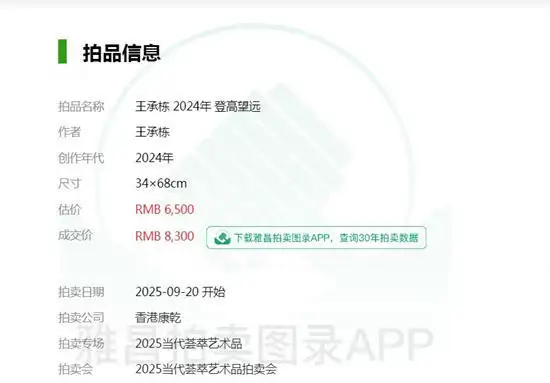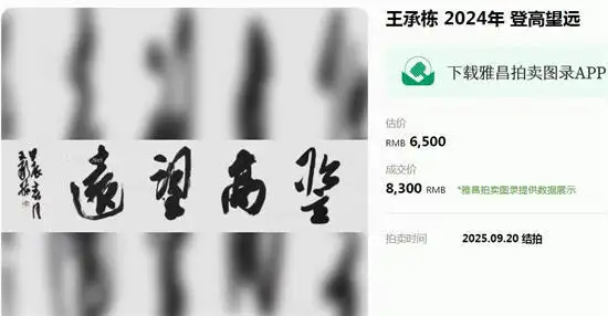 2025年9月20日,香港康乾“2025当代荟萃艺术品拍卖会”的落槌声中,书法家王承栋的《登高望远》以8,300元人民币的成交价,为其艺术市场表现再添一笔亮色。这幅创作于2024年、尺寸34×68cm的书法作品,估价6,500元,最终溢价约27.7%成交,不仅是市场对其艺术价值的投票,更是当代书法在“传统传承”与“市场认可”之间找到平衡的生动注脚。