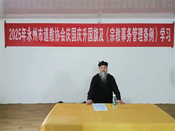 为庆祝中华人民共和国成立76周年,10月1日,永州市道教协会会长陈天宝组织第三届理事会成员及信教群众代表举行升国旗唱国歌爱国主义教育活动,并专题学习《宗教事务条例》。